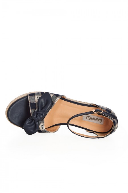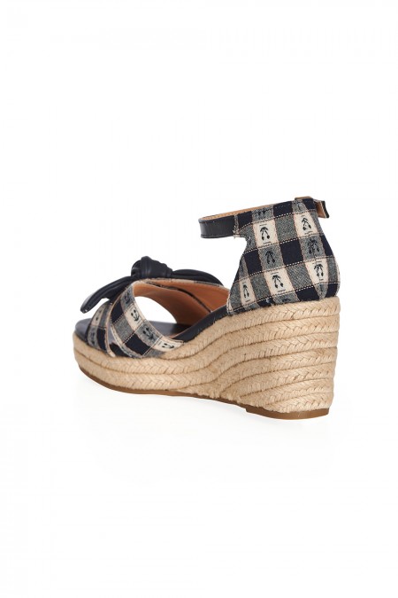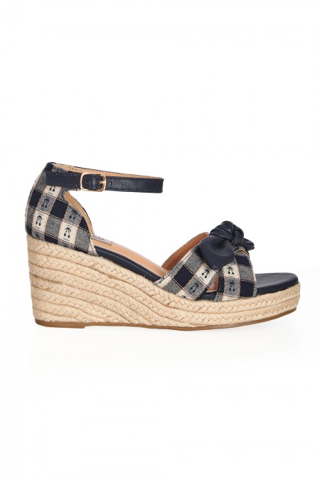 Sandales compensées tissées vichy bleu et petites cerises