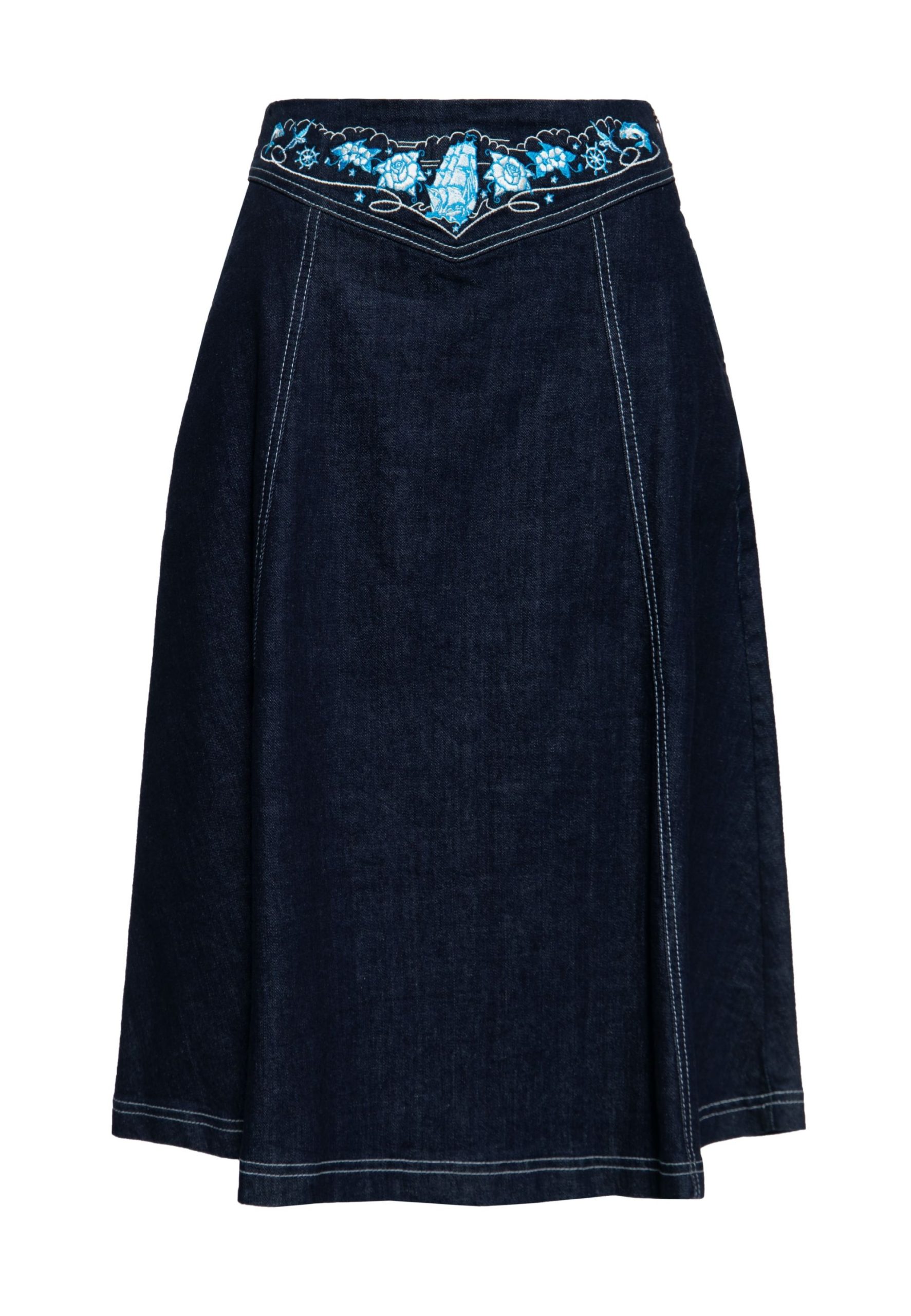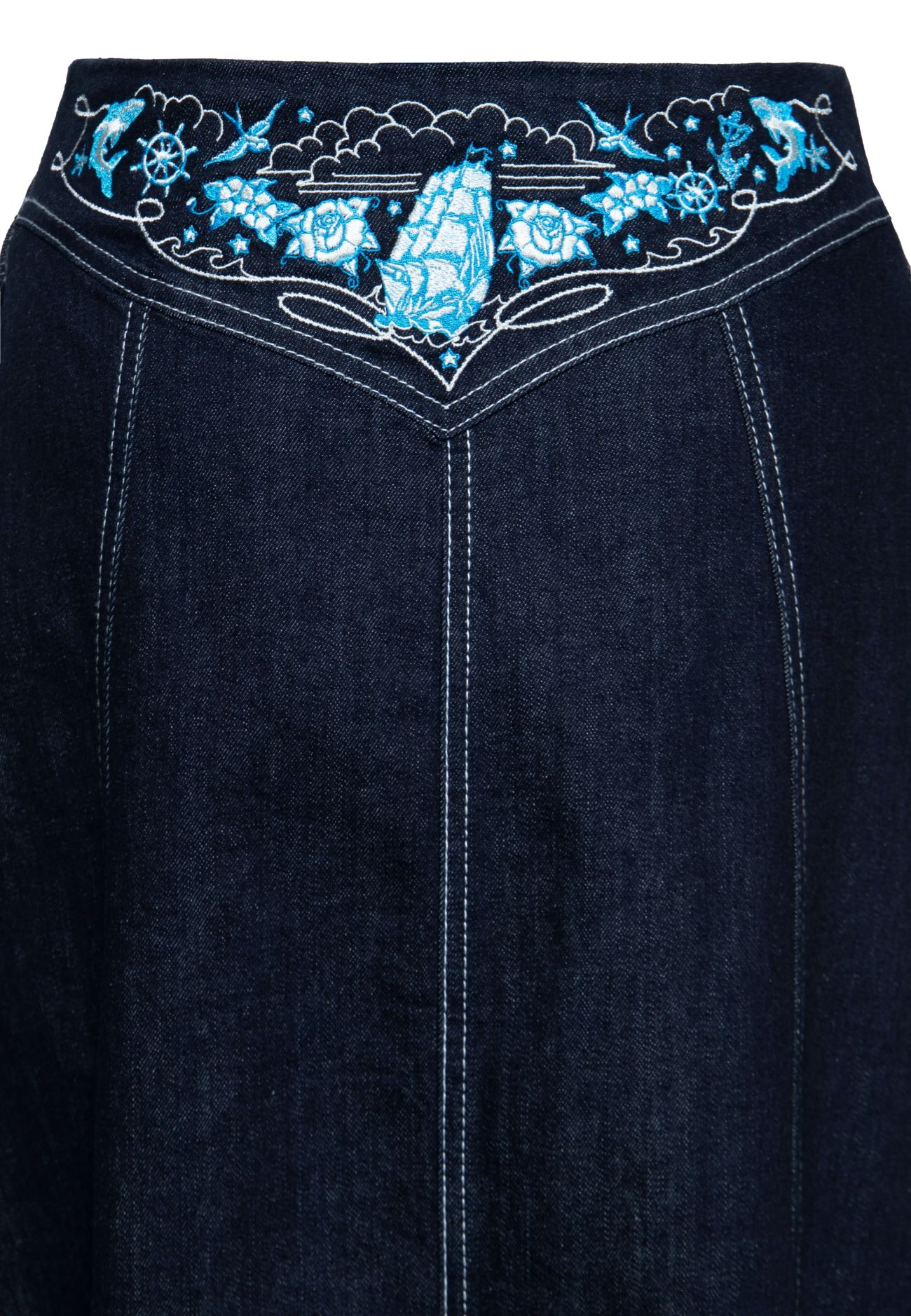 Jupe évasée en jeans style Rockabilly 1950’s avec broderie old school sur la ceinture