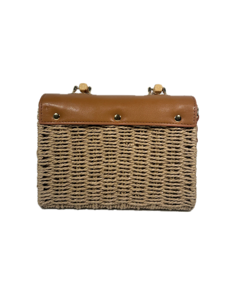 Sac à main en osier style tiki tropical inspiré des années 50 avec anse en bambou et rabat en simili cuir.