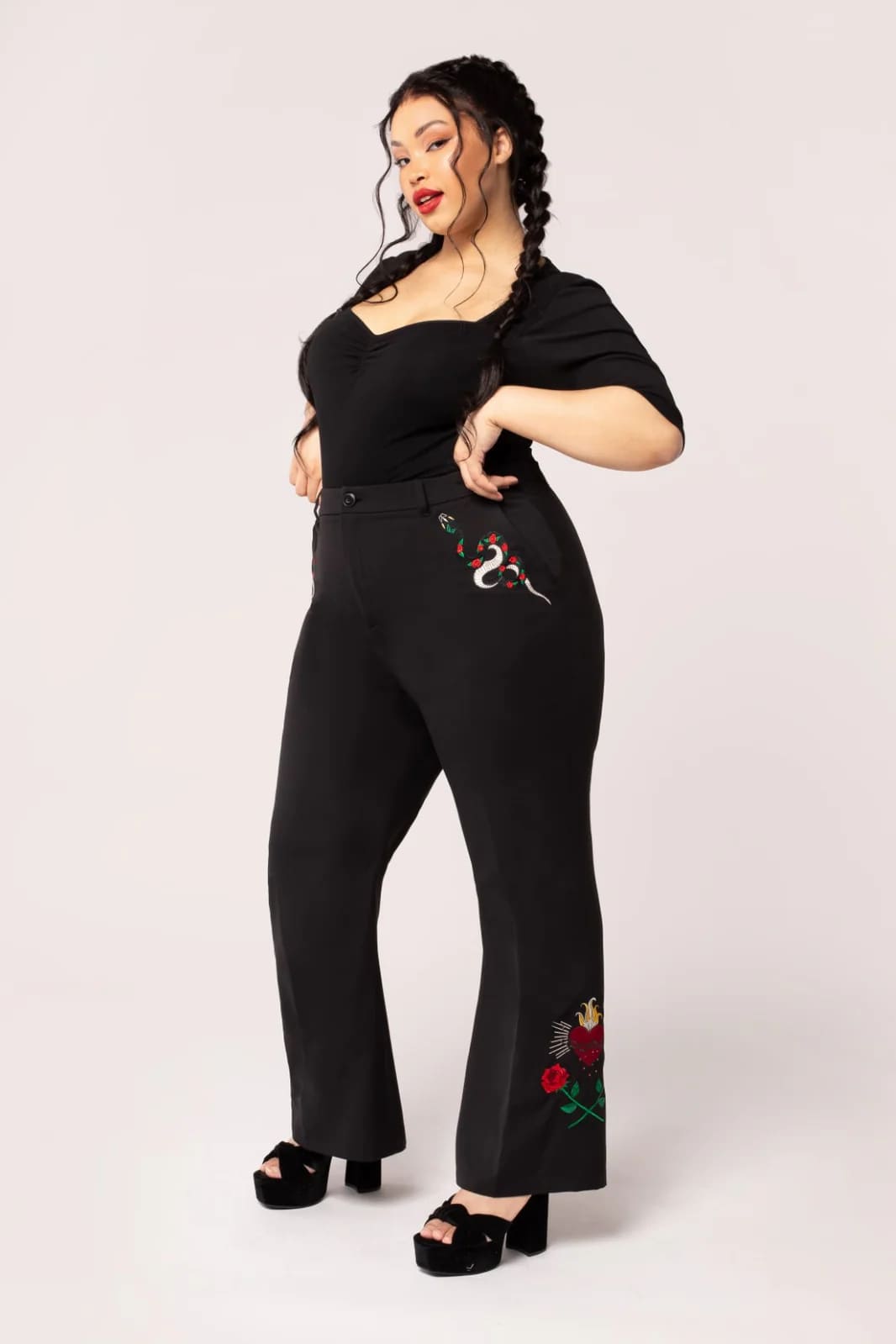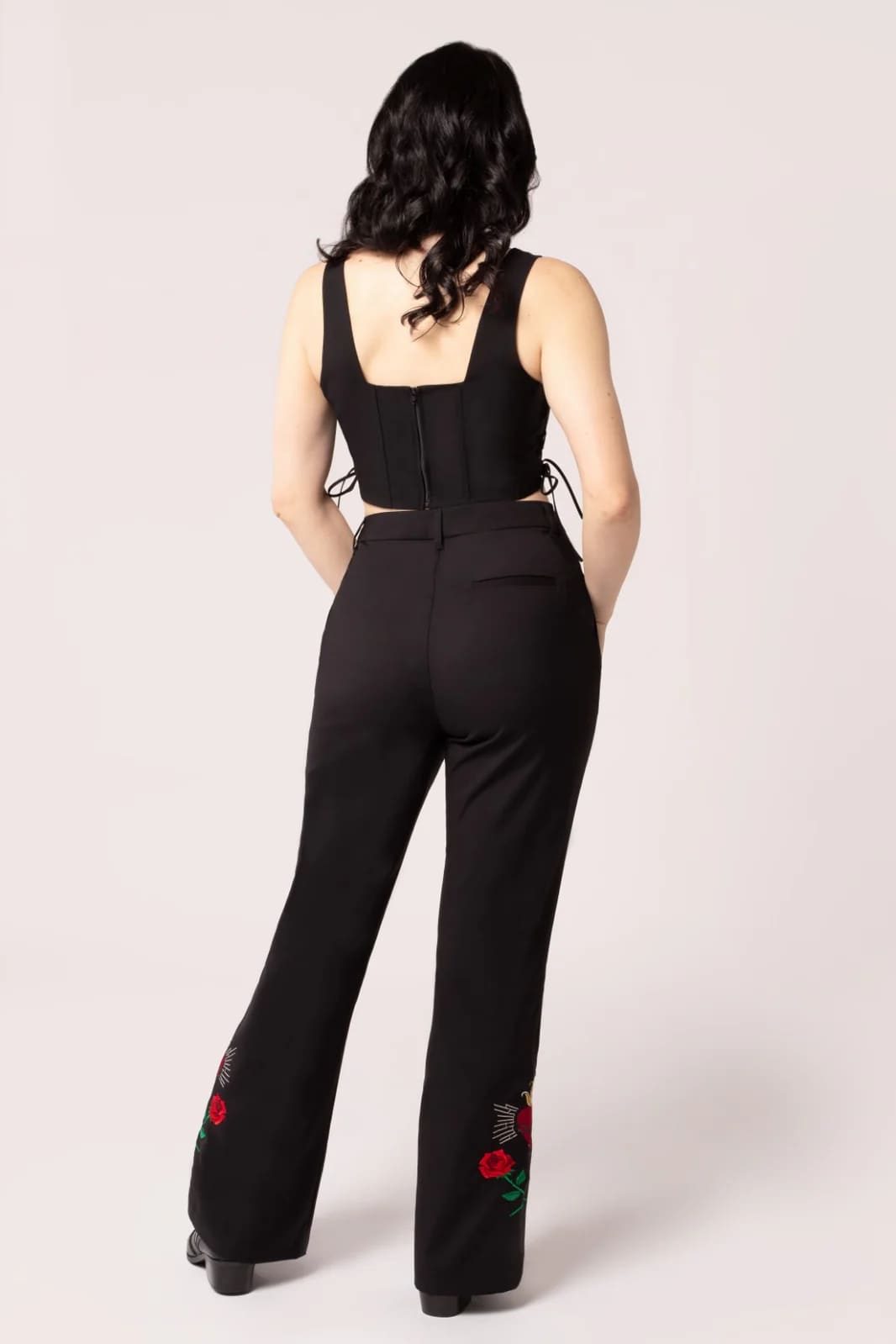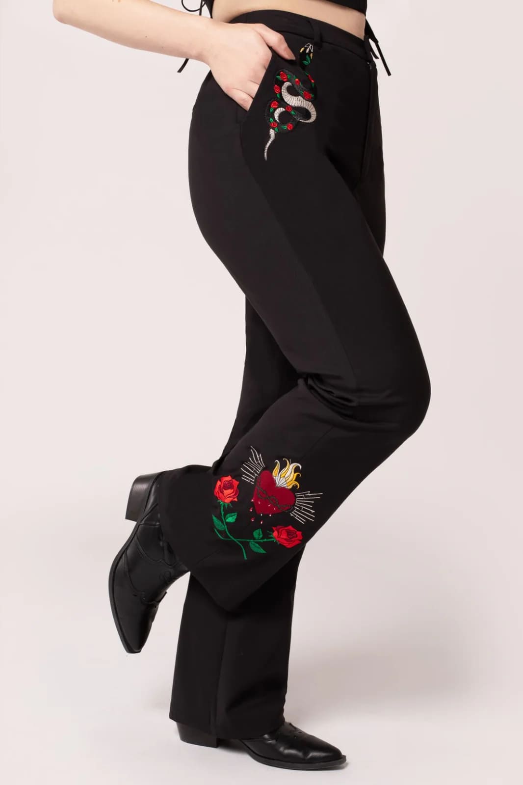 Pantalon taille haute coupe patte d’éléphant, brodé aux poches et sur le bas des jambes.