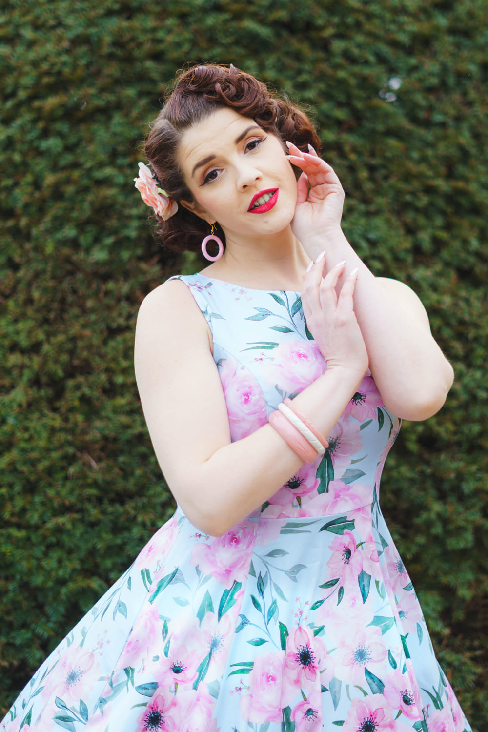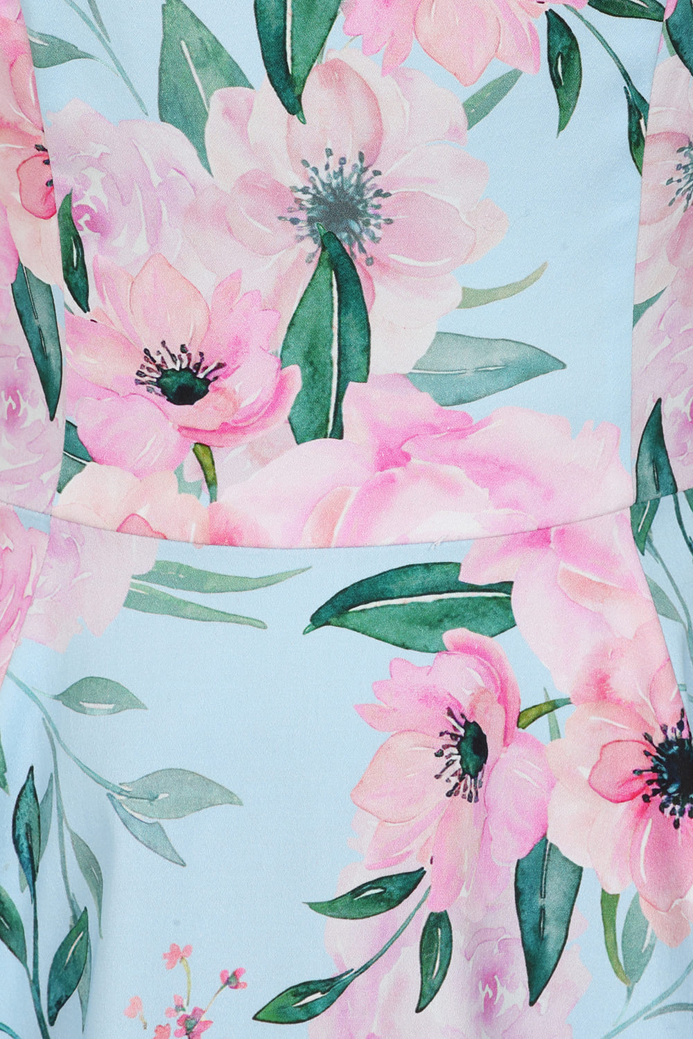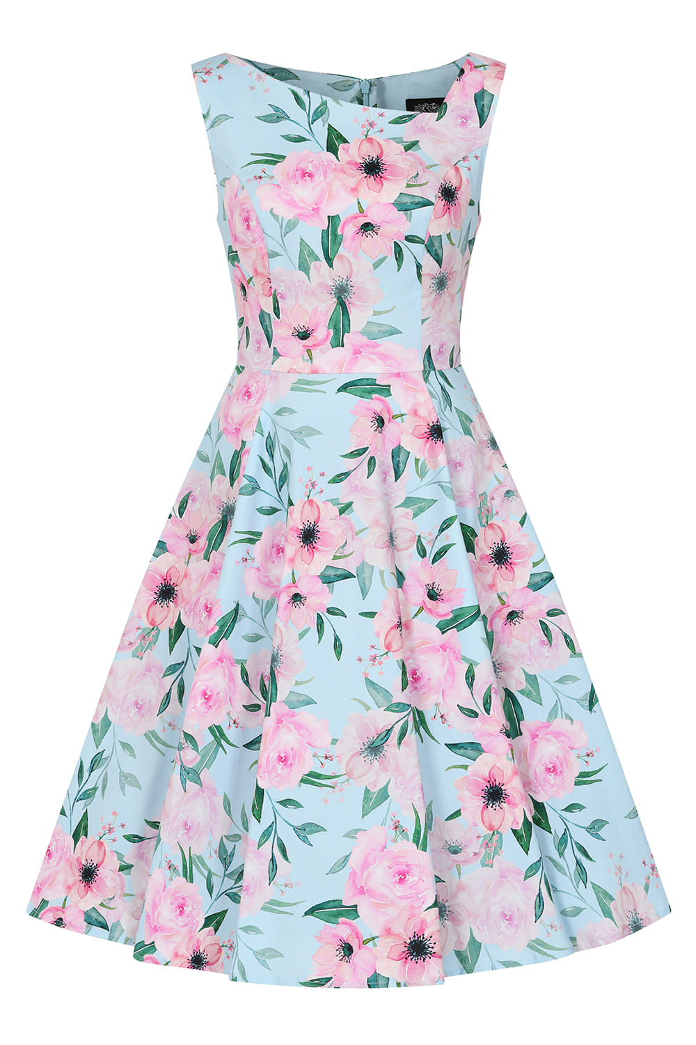 Robe rétro style pin-up 50’s avec imprimé floral rose sur fond bleu ciel.