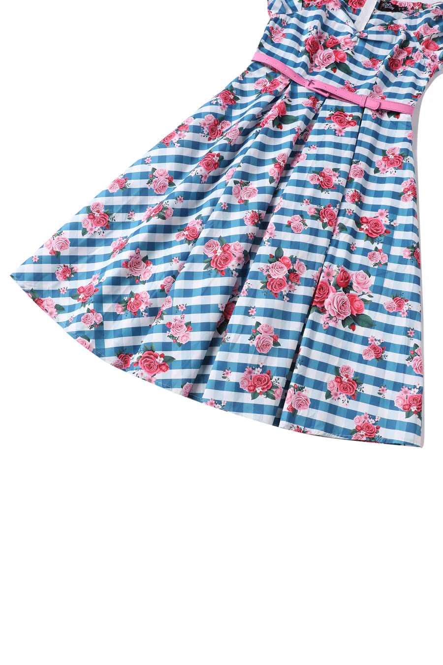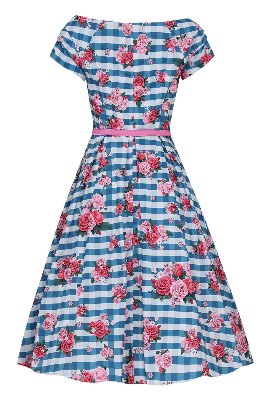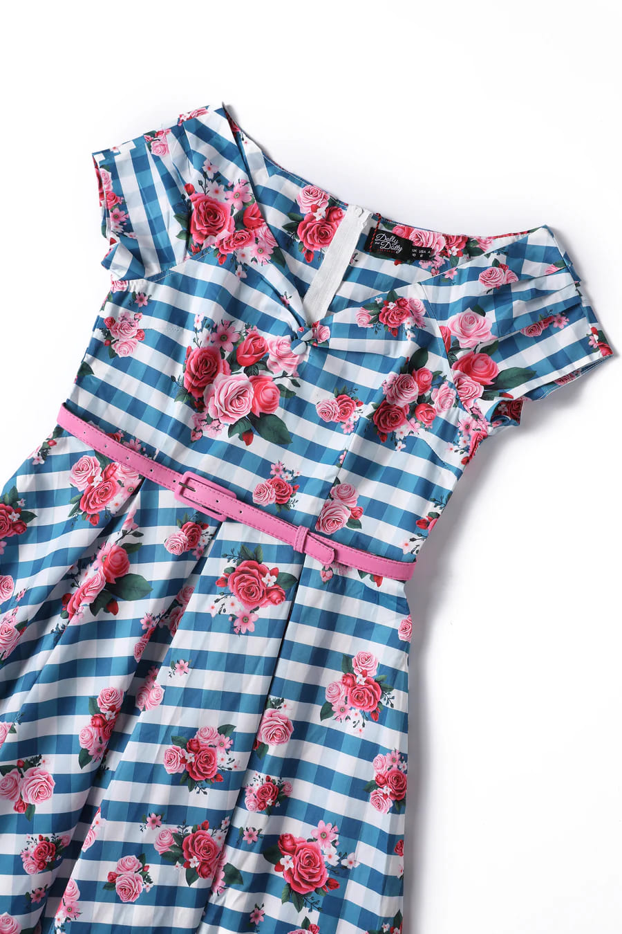 Robe style pin-up anglaise avec décolleté princesse et imprimé vichy bleu et fleurs roses.