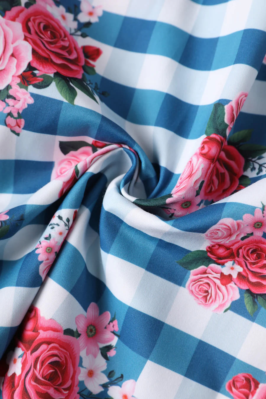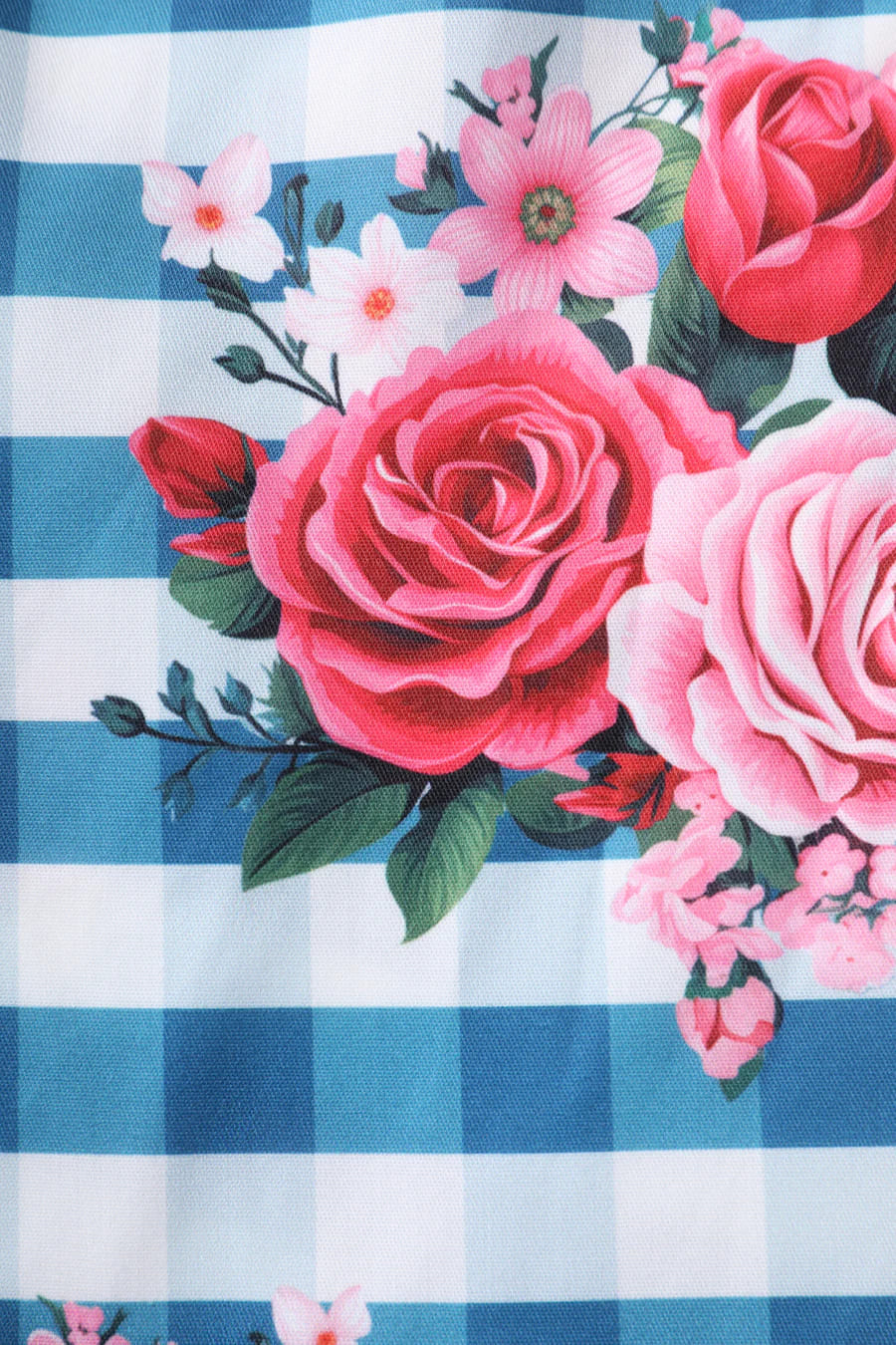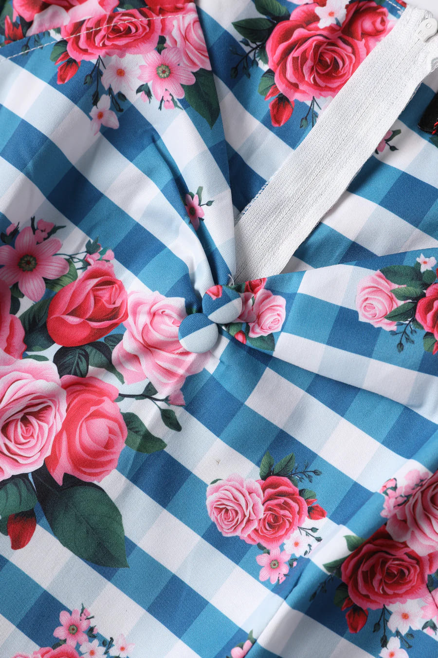 Robe style pin-up anglaise avec décolleté princesse et imprimé vichy bleu et fleurs roses.