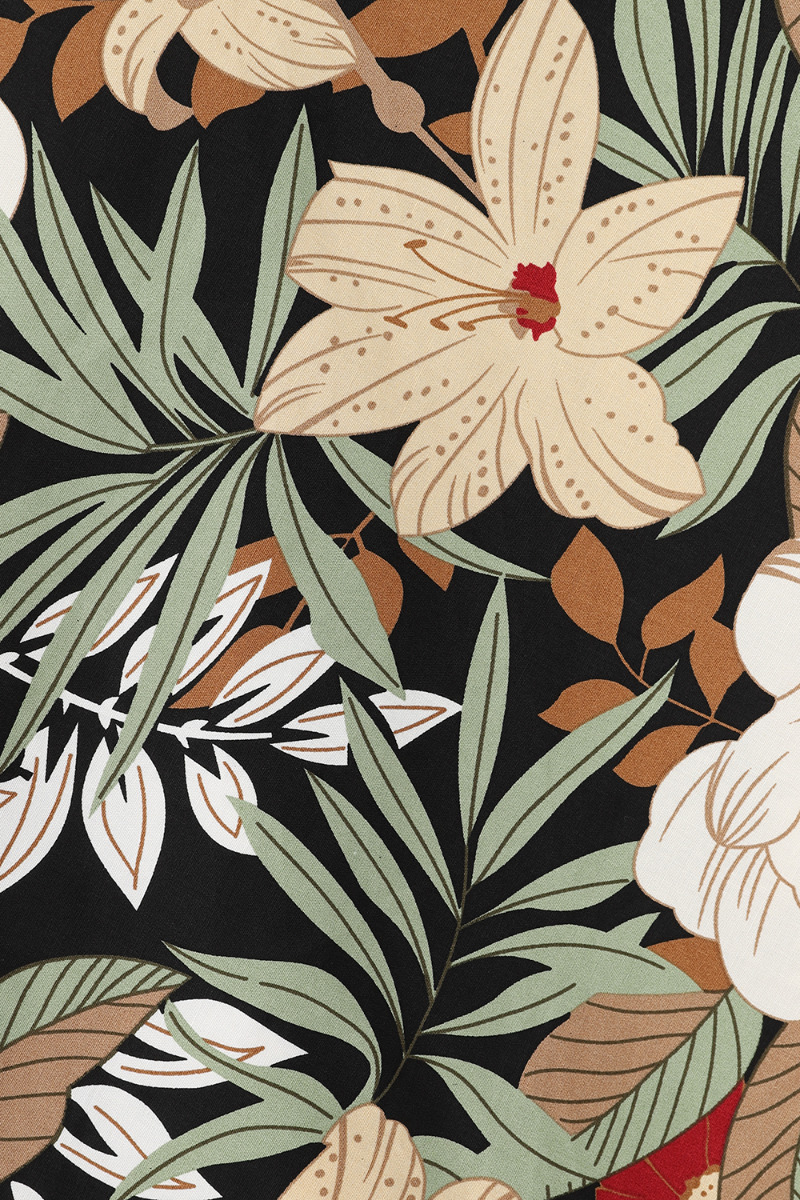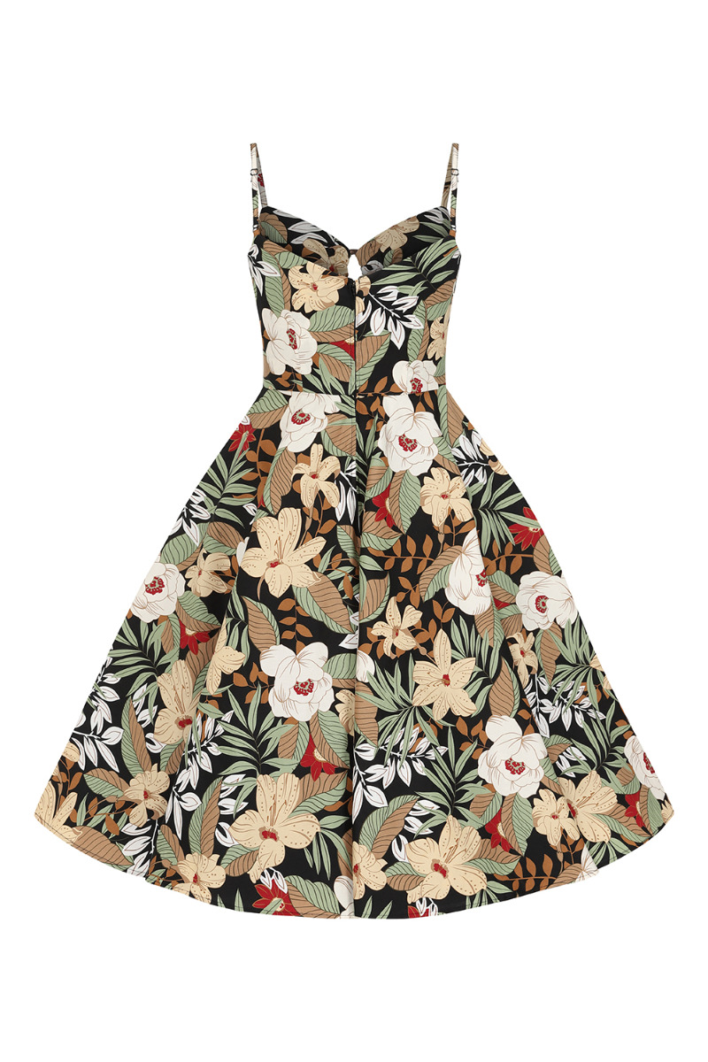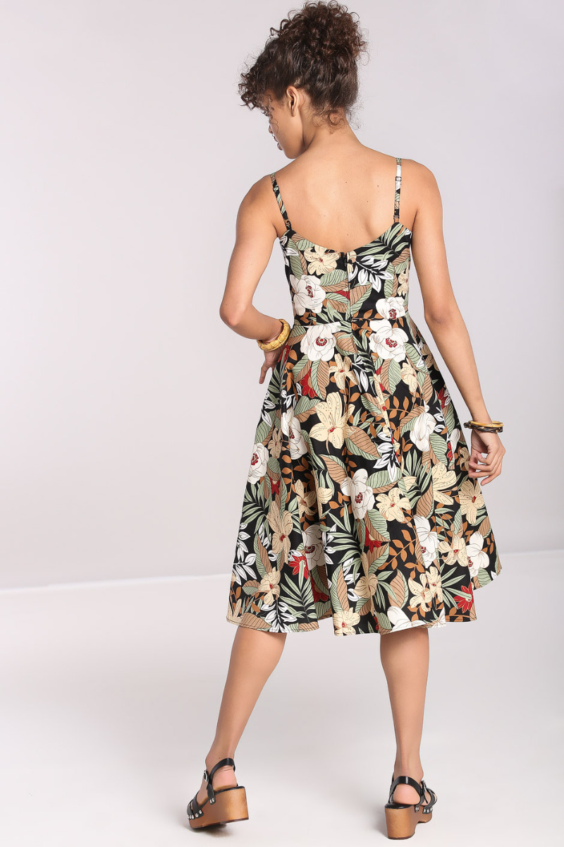 Robe midi (mi-longue) en coton imprimé tropical style pin-up tiki