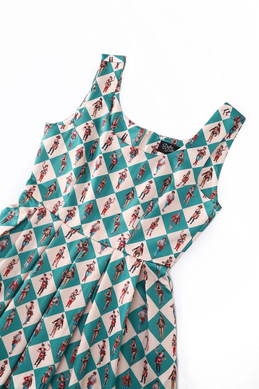 Robe pin-up satinée à motif imprimé inspiré des cirques vintage.