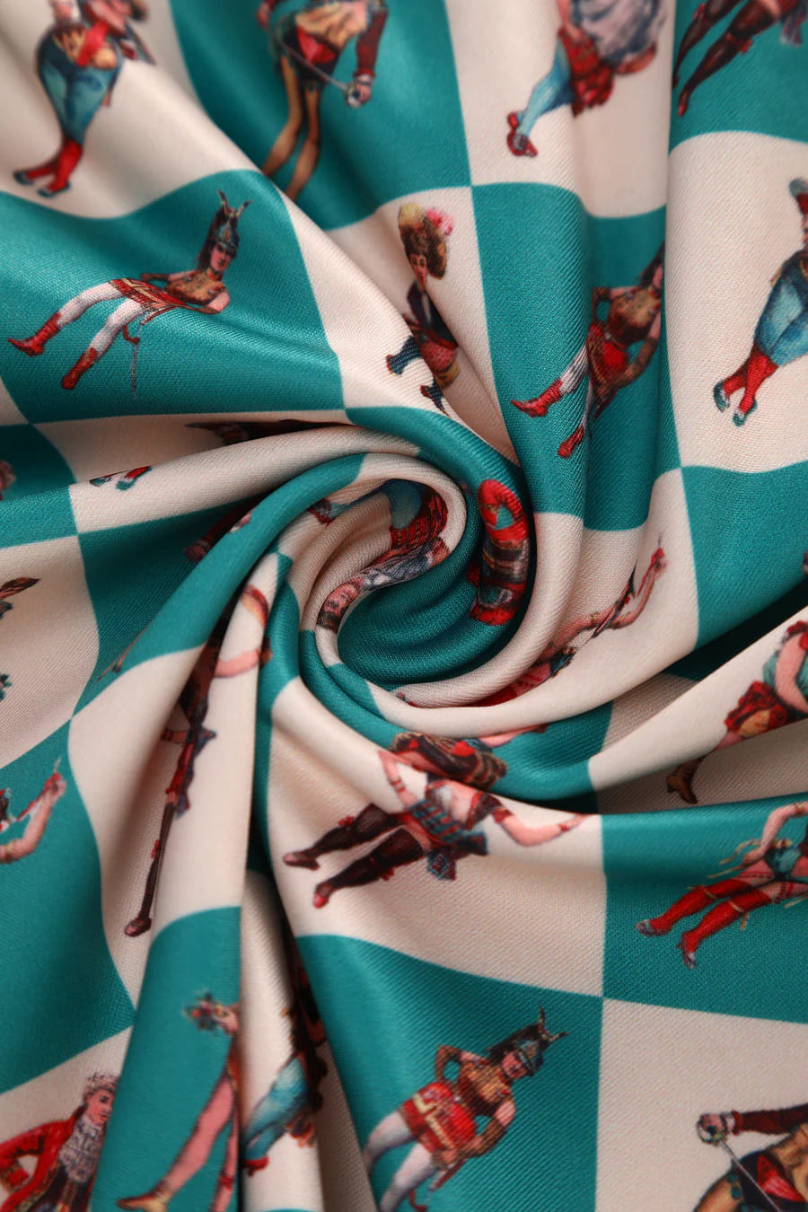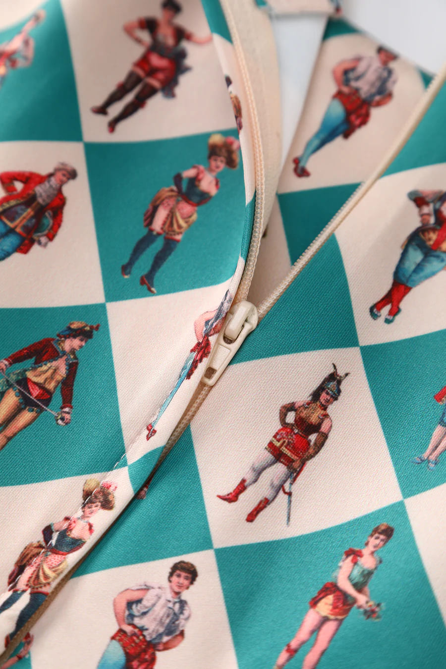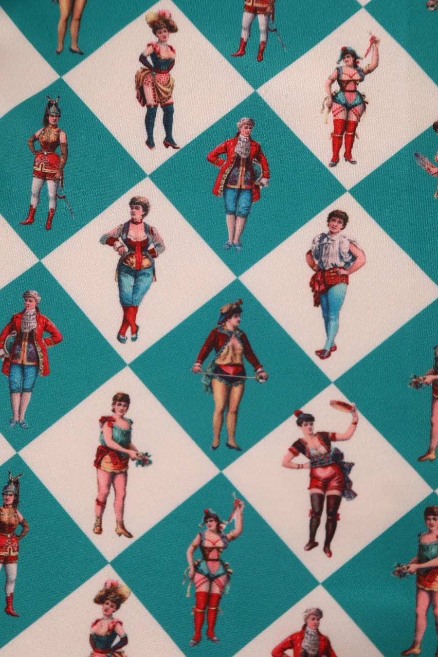 Imprimé inspiré des cirques vintage, sur fond arlequin vert et blanc cassé.