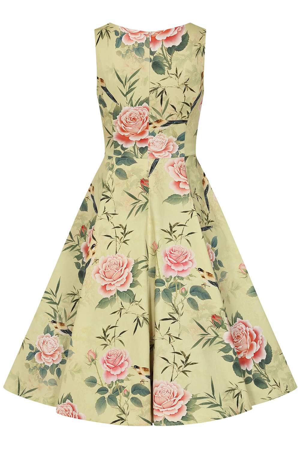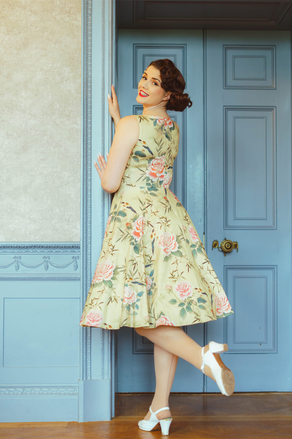 Robe rétro style pin-up 50’s avec imprimé floral rose sur fond vert clair.