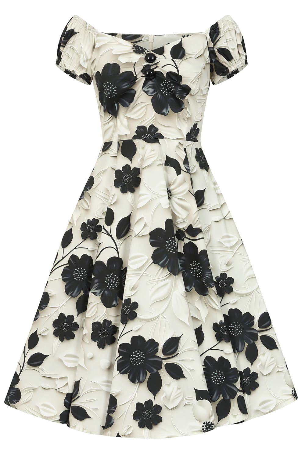 Robe swing style pin-up avec impression florale en 3D et manche ballon.