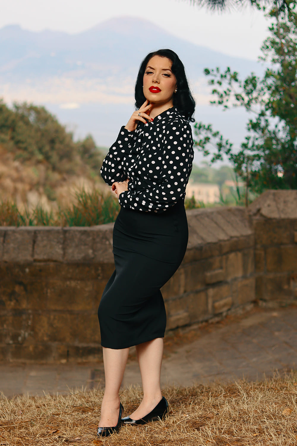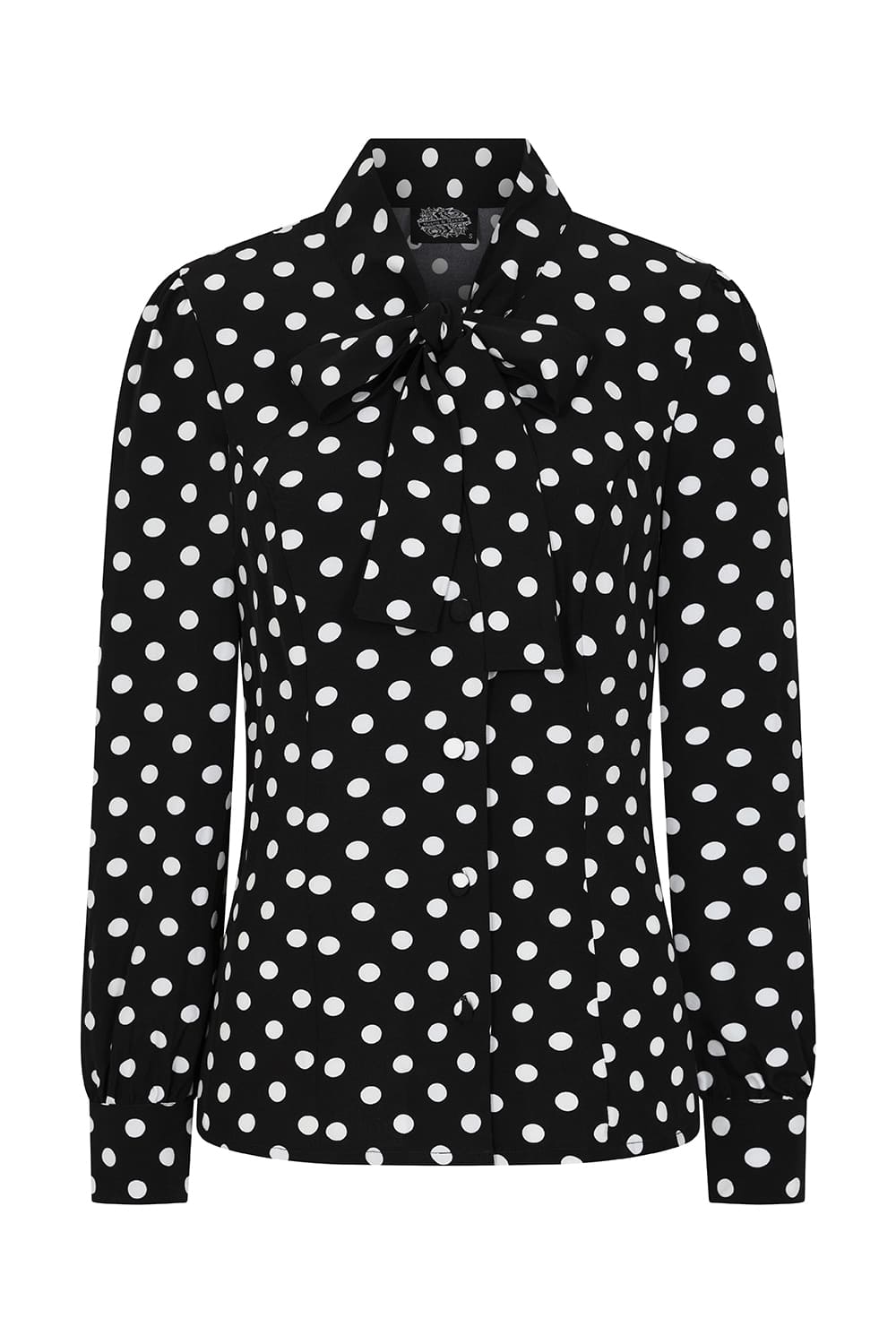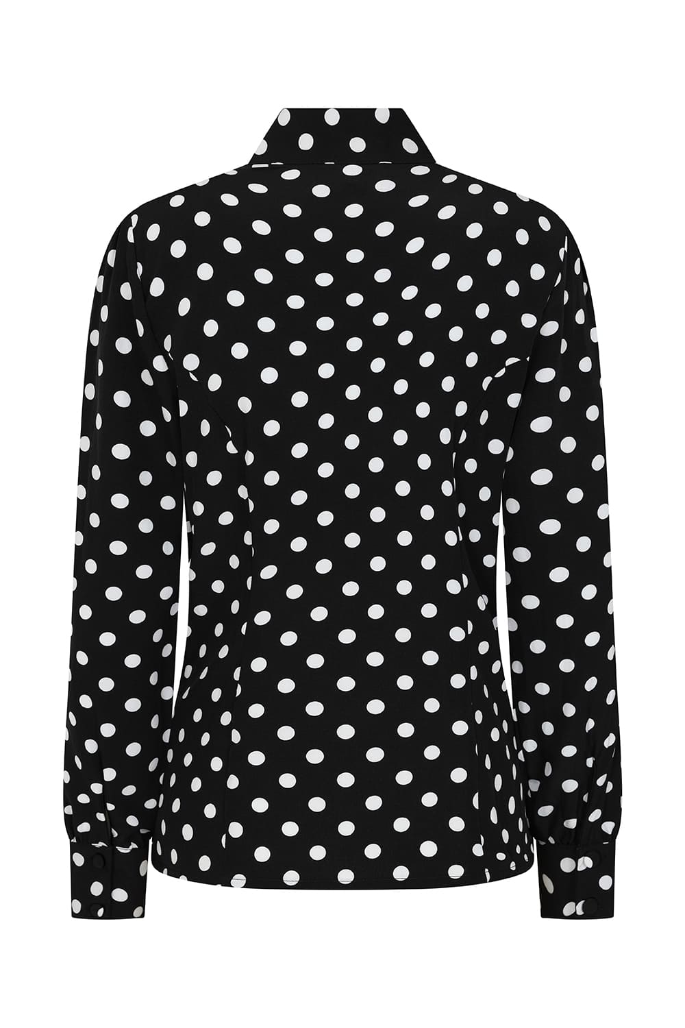 Chemisier avec col à nouer, noir imprimé pois blancs, inspiré des années 50.