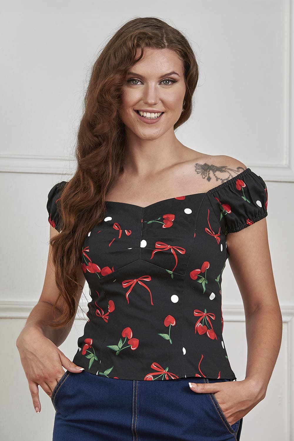 Top rockabilly classique des années 50, coupe ajustée avec un large décolleté et des manches courtes froncées, pouvant se porter épaules dénudées ou découvertes.
