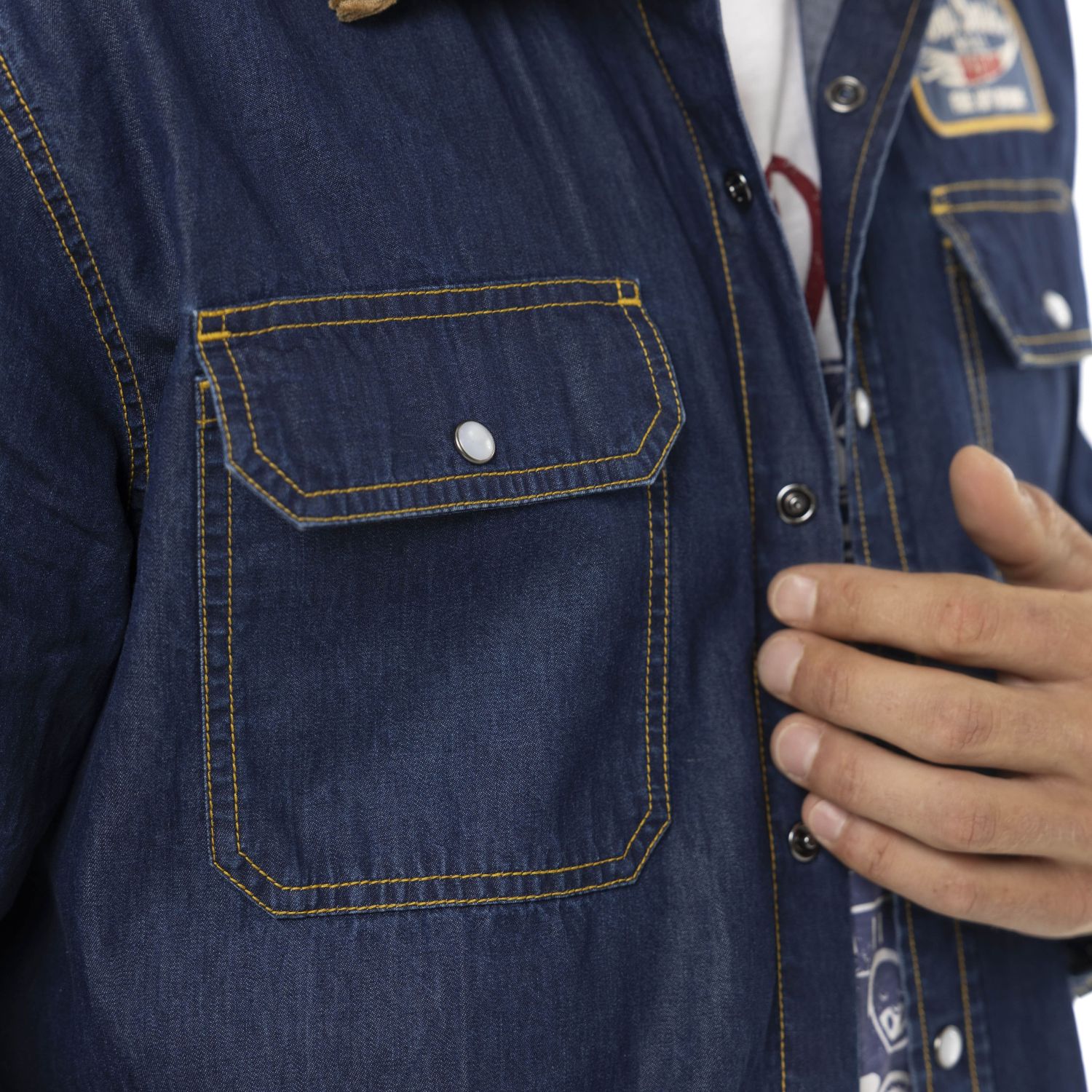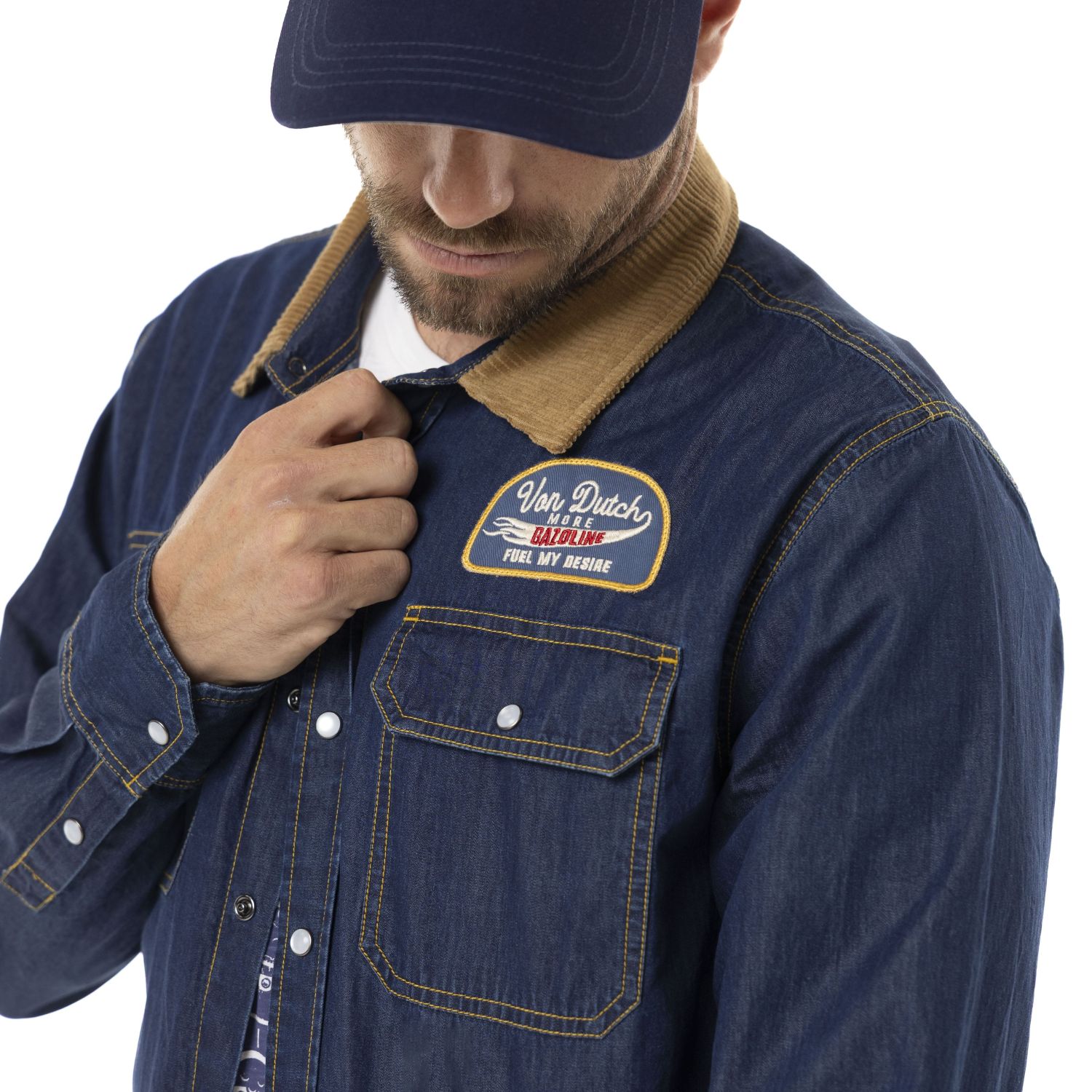 Chemise homme style pompiste années 50 en denim avec écussons et col velours.