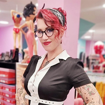 Co-fondatrice de l’enseigne, c’est en couple avec Taz le Boss que tout a commencé. Elle est responsable du magasin, community manager et conseillère de vente. Passionnée de mode et d’histoire de l’art, elle met toute son expérience et son savoir-faire à votre service . Elle est l’image de la Pin-up moderne !